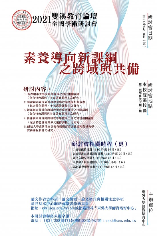 因應新課綱之推動,東吳大學師資培育中心以「素養導向新課綱之跨域與共備」主題,原訂於 110 年 5 月 14 日(星期五)假東吳大學雙溪校區舉辦「2021 雙溪教育論壇全國學術研討會」,因故延期至 110 年 6 月 18 日(星期五)。