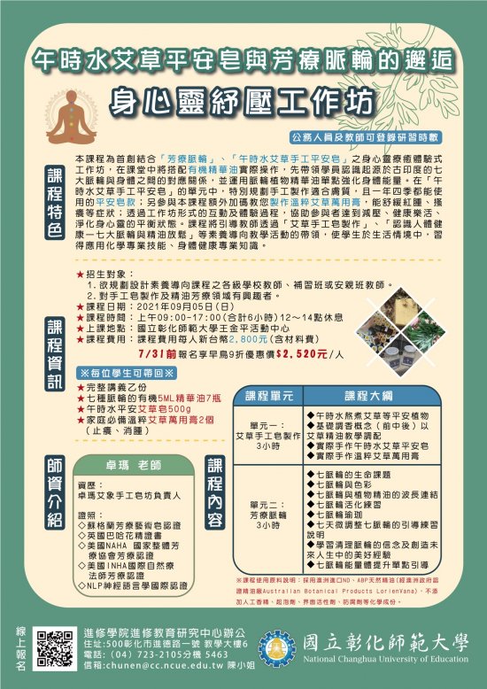 「午時水艾草皂與芳療脈輪的邂逅-身心靈紓壓工作坊」課程時間為 110 年 9 月 5 日(日) 上午 09:00-17:00 ,合計 6 小時,公務人員及教師可登錄研習時數,課程費用為每人 2,800 元(含材料費), 7/31 前報名享 9 折優惠價每人 2,520 元。