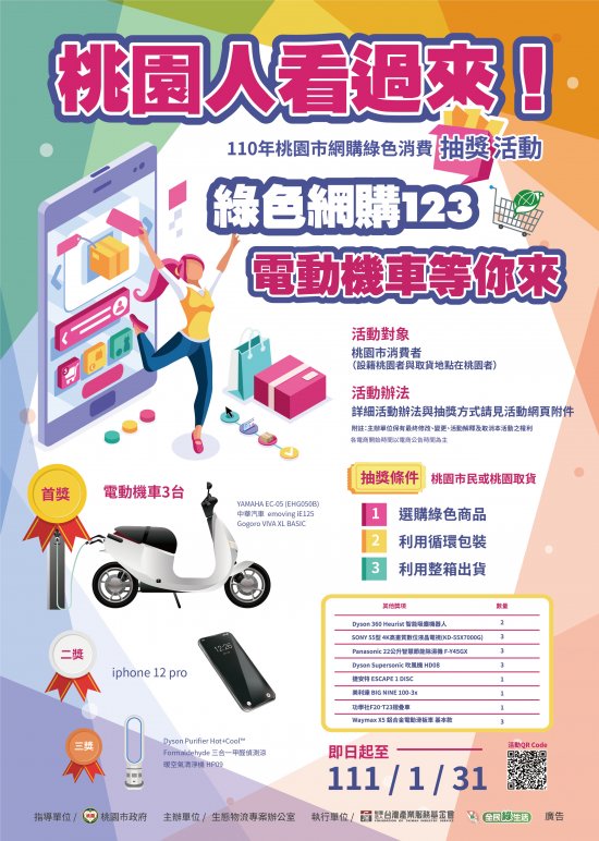 一、為提升消費者綠色消費意識及減少網購包裝垃圾量,凡設籍於桃園市或取貨地點在桃園市者於合作網購電商平台購買綠色商品,或是選用循環包裝袋出貨,皆可參加抽獎,獎項豐富,包括電動機車、智慧型手機、冷暖空清淨機等,本活動自即日起至 111 年 1 月 31 日止。