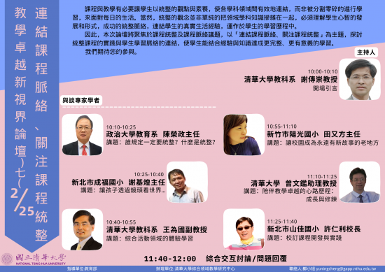 轉知國立清華大學辦理「教學卓越的新視界(七):連結課程脈絡、關注課程統整」線上論壇訊息。