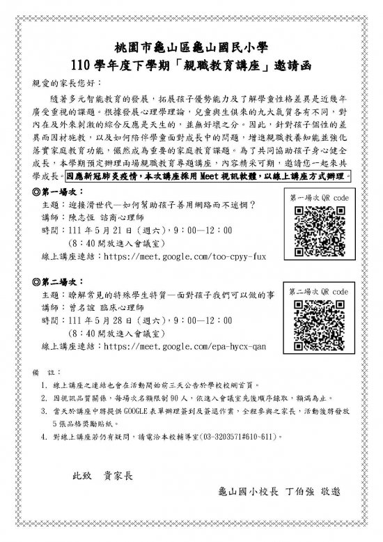 因視訊品質關係,每場次名額限制 90人,依進入會議室先後順序錄取,額滿為止。當天於講座中將提供 GOOGLE表單辦理簽到及簽退作業,全程參與之家長,活動後將發放 5張品格獎勵貼紙。對線上講座若仍有疑問,請電洽本校輔導室(03-3203571#610~611)。