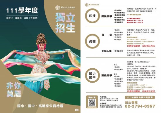 3、 高職部:京劇科、民俗技藝科、戲曲音樂科、歌仔戲科、客家戲科,僅招收高職一年級學生。