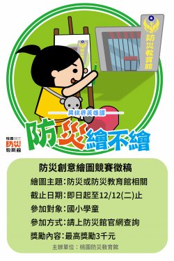 | 三、 | 徵件對象為對繪畫創作有興趣之國小學童,收件時間為即日起至 112 年 12 月 12 日(星期二)截止,詳情請見防災教育館網站(https://tydec.tyfd.gov.tw)。 |