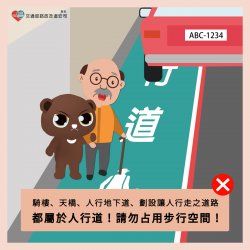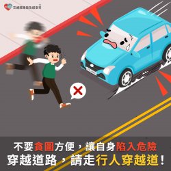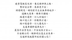 疲勞駕駛易失誤,養足精神再上路。 繫好安全帶,乘車更平安。 綠燈剛亮,確認前方左右無車再起步。 遠離大客車,騎車不鑽縫。 路邊不違停,行人好通行。 路口退三步,秒數夠才過。 路口慢看停,行人優先行。 支道車讓幹道車先行。 晨昏外出穿亮衣,平安返家才安心。 不老騎士們,騎車時注意左右來車。 交通部及桃園市政府關心您!