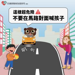開車當心路口,減速停讓再走。 轉彎讓直行,安全你最行。 騎車戴帽勿蛇行,路上安全你最行。 遠離大客車,騎車不鑽縫。 穿越道路玩手機,出事肇禍悔不及。 使用行人穿越道,聰明的你走正確的路。 路口慢看停,行人優先行。 看到閃光紅燈,請停車再開。 衫褲穿乎金,過路金安心。 不老騎士們,騎車時,遠 離 大 型 車 。 交通部及桃園市政府關心您!