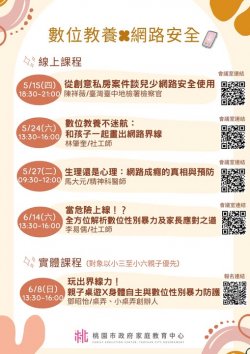 | 三、 | 旨揭課程詳細資訊,請見中心課程行事曆( https://reurl.cc/xlGyGL )或追蹤「桃園市政府家庭教育中心」FB 粉絲專頁;另倘有家庭教育個別化服務需求,可撥打 4128185 家庭教育諮詢專線,本市市民可申請小桃家線上諮詢室(預約連結: https://reurl.cc/oZWOY5 ),由中心媒合專業人員透過線上會議室提供服務。 |