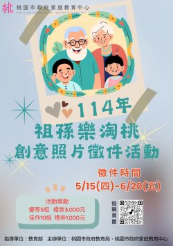 | 二、 | 「祖孫樂淘桃創意照片徵件活動」係鼓勵民眾紀錄祖孫互動的溫馨時光,徵件期限至 6 月 20 日(星期五)止,惠請協助宣傳並鼓勵民眾參加,獎項及獎品如下: |