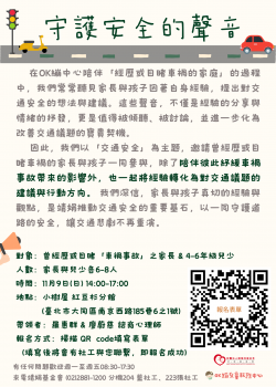 該會以「交通安全」為活動主題,邀請曾經歷或目睹車禍之家長及兒少共同參與,期協助家長及兒少紓緩事故影響之餘,並凝聚意見並討論交通環境的改善方向。