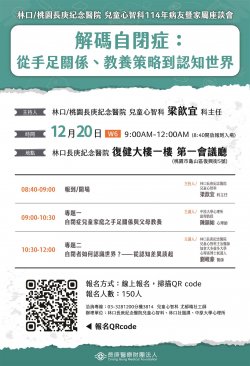 轉知長庚醫療財團法人林口長庚紀念醫院(以下稱長庚醫院) 辦理兒童心智科病友暨家屬座談會「解碼自閉症:從手足關係、教養策略到認知世界」